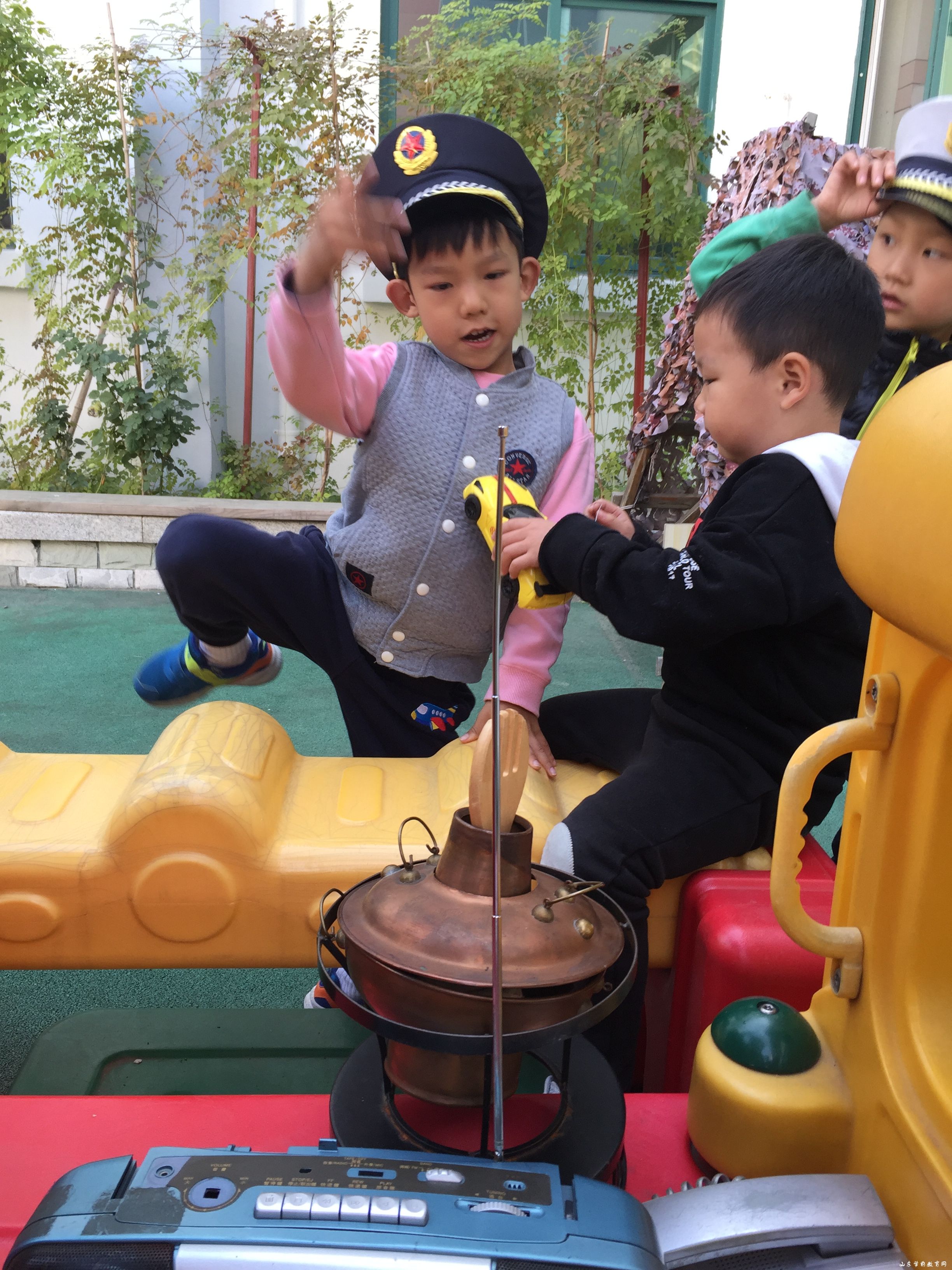 活动刚开始,越越和恩畅就互相商量着需要的材料,越越手里拿着几个针管问:咱们的“门诊”开在什么地方?恩畅说:“咱们得找个特别的地方”,说完后他巡视周围,说:“就在小滑梯入口那里吧”,于是他们两个把需要的材料搬放到了滑梯入口的位置。并大声吆喝:“我要开门诊了,有生病的可以找我看病啦”!差不多快准备完毕的时候,修跑过来:“我生病了,我在外面指挥交通,淋雨了,有些感冒,你能帮我看看吗?”畅很爽快的答应了:“你是我们的第一位病人,很高兴为你看病”。这时恩畅手里拿着一个黄色的小跑车,据他介绍说这是号脉的小垫子。(见图1)恩畅给靖修号脉结束后说:“你这个病不是什么大病,就是肠胃不好,但是需要调理,你看这样行吗?我给你煎一点中药,调理一下身体,这样你的病会很快好的。”靖修爽快的答应着:“好的,谢谢你!”于是,恩畅就把自己取来的锅调整好位置,在里面加了很多“中药”(实际上恩畅在里面加的是红酒的木塞子),放好中药,盖上锅盖,开始煎药了,恩畅用一个小木铲子不断在锅里进行搅拌,他告诉我说:“在煎中药的时候,要不断的搅拌,这样煎出来的药才不会糊。”(见图2)